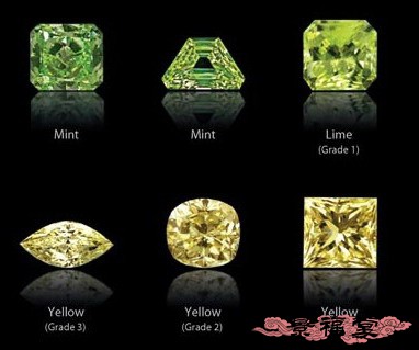 绿钻:呈淡绿、艳绿色。绿色钻石的形成原因,是受到自然辐射而改变晶格结构所致。