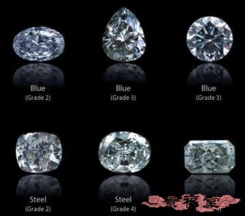 蓝钻:呈淡蓝色、艳蓝色。钻石在形成过程中,吸收微量硼元素,钻石便显天蓝色。