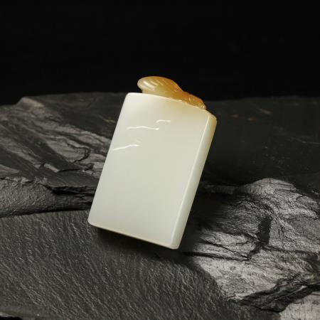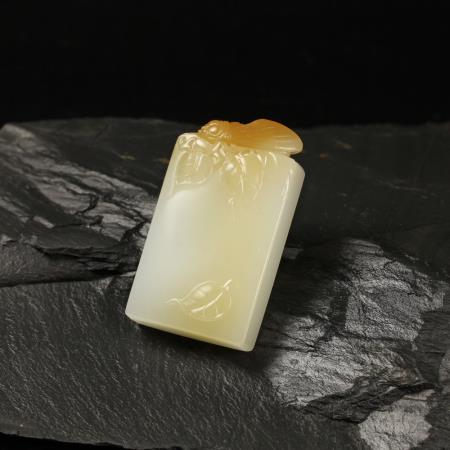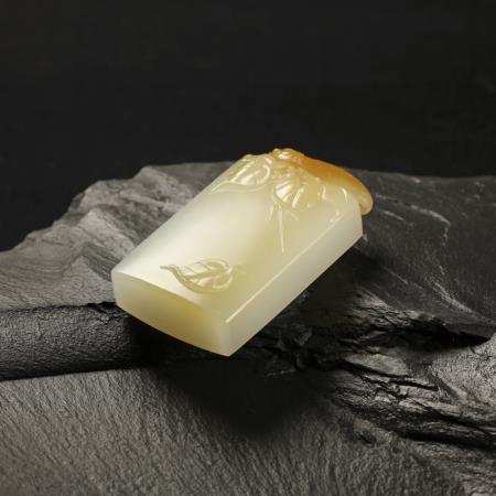 作品雕工精良,玉质缜密细润,作者巧用糖色俏色雕琢玉蝉高踞玉牌顶端,鼓翅而鸣,身下梧桐繁枝茂叶,有秋风过,一叶飘然零落。此玉牌牌型工整大气、画面动静相生,又以糖白玉独有的色泽来表现秋风梧桐之景,更是相辅相成,别具韵味。