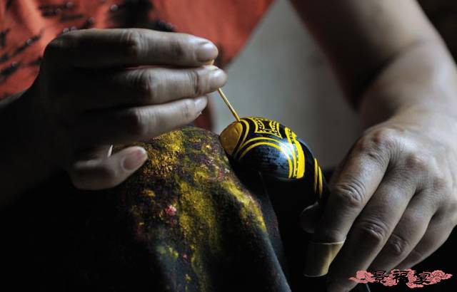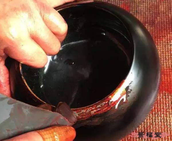 推光是漆器剔犀工艺的最后一个步骤,用老旧房子上的灰砖粉末细细打磨漆器剔犀工艺品的每一个角落,用适当的力度,上百次的打磨,才能抛光出灿烂的漆器剔犀工艺品。