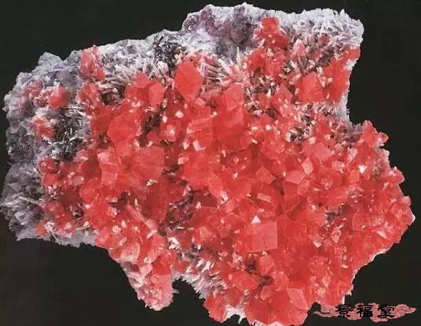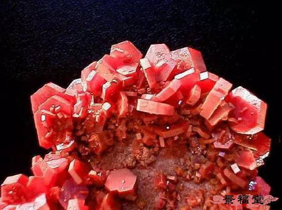 这块由 MOROCCO 产的钒铅矿,六角形短柱状,晶体鲜红而透光,结晶完美而丰富, 为收藏之极品!硬度3,形成于铅矿床的氧化带。
