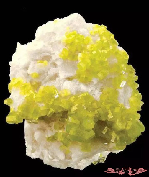 磷氯铅矿晶体多作六角柱状或作圆桶状。有的当中有孔,有的中空。松脂光泽,半 透明;淡黄、黄或棕色. 本矿造形优美,结晶丰富,有如朱铭木雕刀凿的气势!