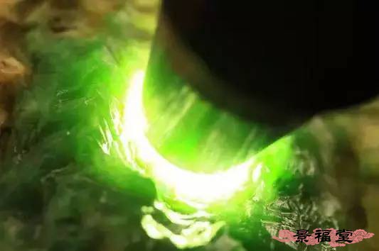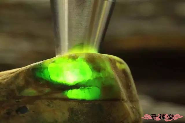 翡翠原石的鉴别方法六:荧光性。无或弱至强的紫外荧光,荧光分布均匀或呈斑杂状。早期“B货”翡翠绝大多数有荧光。短波:弱,黄绿或蓝绿(蓝白);长波:中至强,黄绿或蓝白色。但近期这种方法处理的翡翠通常荧光强度较弱或无荧光。