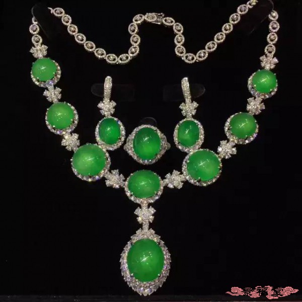 其中糯种帝王绿,属于近代翡翠里的极品,材质结构丝絮状,透光看,质地细密,晶莹闪烁,绿丝悬浮,抛光后表面没有现代翡翠的水晶折光感,帝王绿给人以内敛凝重闻名于世,价值连城。