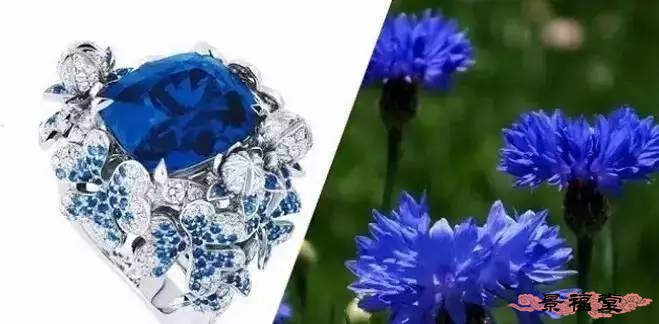 矢车菊是德国的国花,而矢车菊蓝宝石,拥有一种朦胧的略带紫色调的浓重靛蓝色,关键是还有一种天鹅绒般的独特质感和外观。这种特殊的质感,来源于宝石内部分布的一些细小的丝状内含物。一般的刻面宝石,由于只靠宝石表面及内部刻面的光线反射,难免光泽偏"硬",并且会有漏光、发暗的情形发生。而矢车菊蓝宝石内部的这些丝状内含物,能够很好地将光线进行漫反射。形成一种柔和的丝绒状质感,而且颜色饱满,不易漏光。