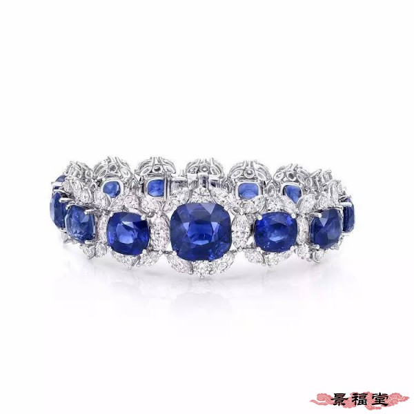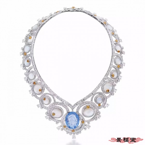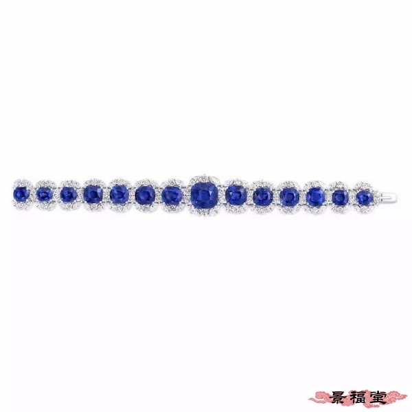 共镶嵌14颗枕形切割蓝宝石,总重68.78克拉,蓝宝石周围镶嵌榄尖形切割和明亮式切割钻石,总重19.25克拉。