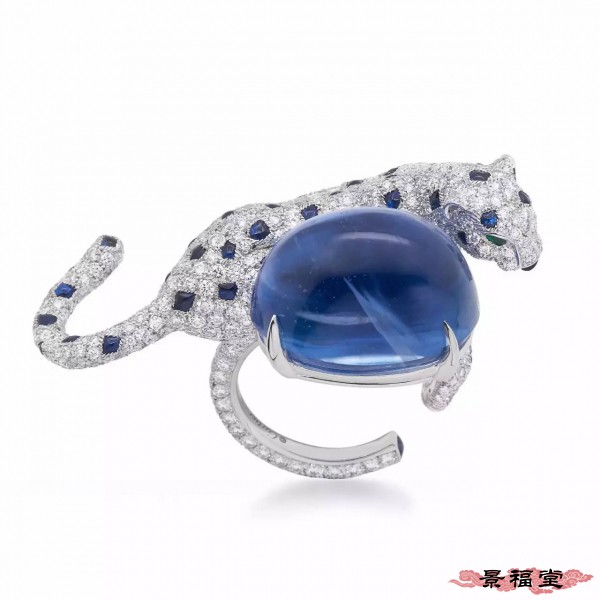 主石为一颗椭圆形弧面切割蓝宝石,豹身镶嵌钻石、蓝宝石,眼睛为祖母绿,鼻子为缟玛瑙,白金戒托镶嵌圆形切割钻石。