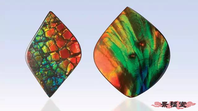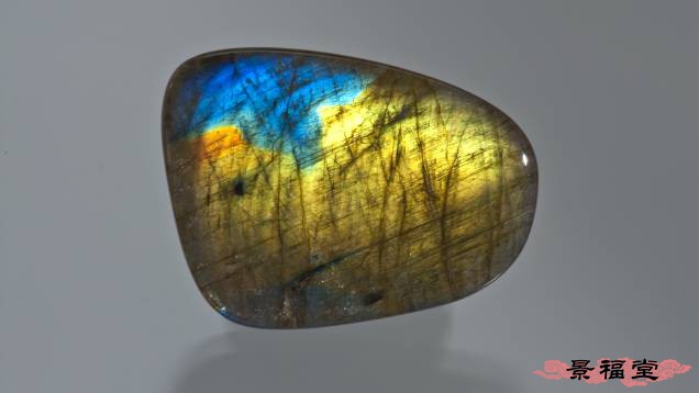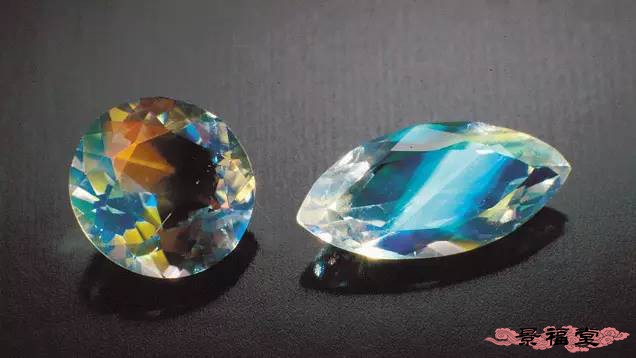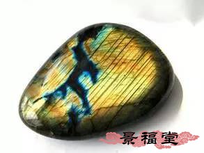 (1)拉长石等宝石转动到一定角度时,见整块样品亮起,可呈现蓝色、绿色及金色、黄色、紫色、红色等各色晕彩,被称为晕彩效应。