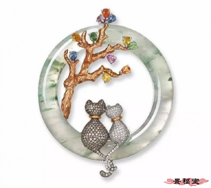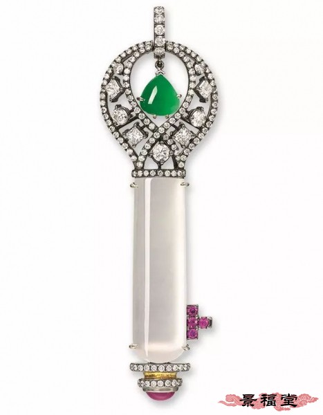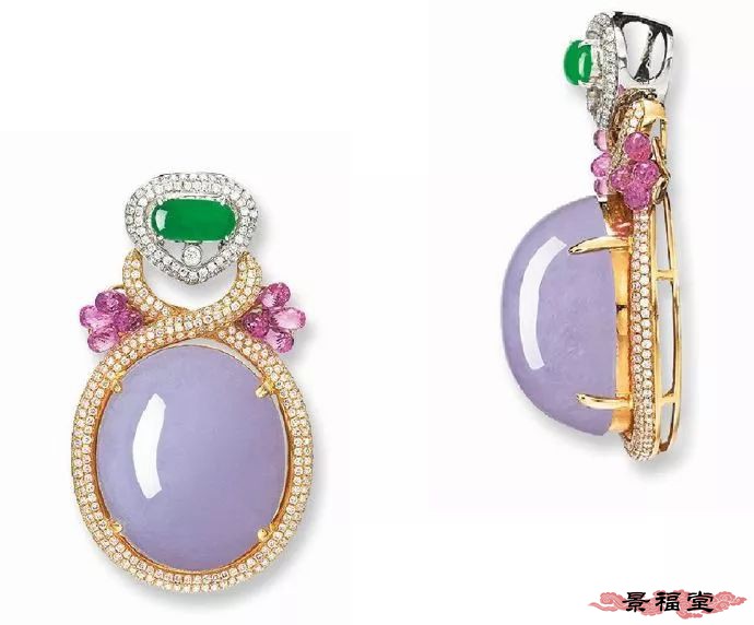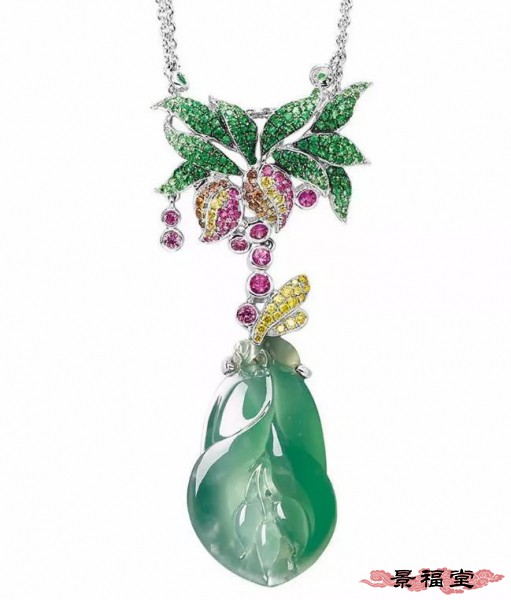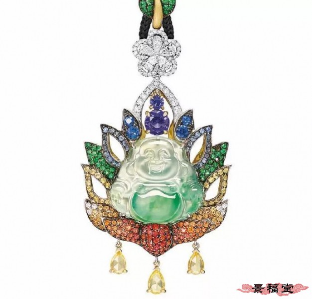 弥勒佛配上彩宝镶嵌的莲花座,仙气十足,同时也制造出精彩纷呈的视觉效果。如今,越来越多的翡翠饰品融入了镶嵌工艺,展现出一种东西方复合的美。在五彩斑斓的宝石、钻石衬托下,翡翠更美了!