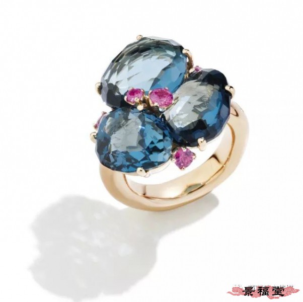 玫瑰金镶伦敦蓝托帕石、粉蓝宝戒指