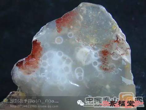 红花冻芙蓉石 在白芙蓉石中偶见一种红花点点散落其间的冻芙蓉石,质通灵,韵别致,称为红花冻芙蓉石,为芙蓉石,为芙蓉石中的神品,难以觅得。