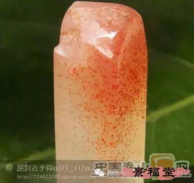 高山桃花冻石 质微透明,色多白、黄,中带细密的红点,深浅大小不一,似三月桃花散落水上,凝而视之,似动非动,如花飘静水。质佳,量少。