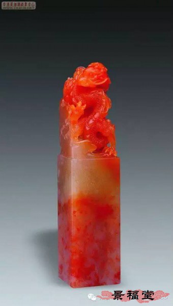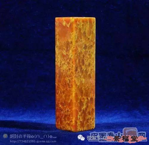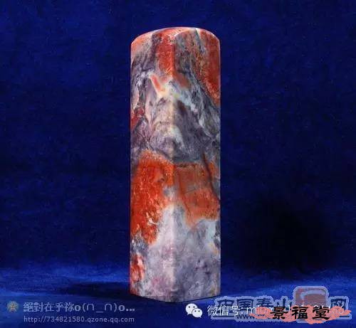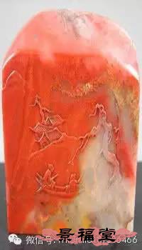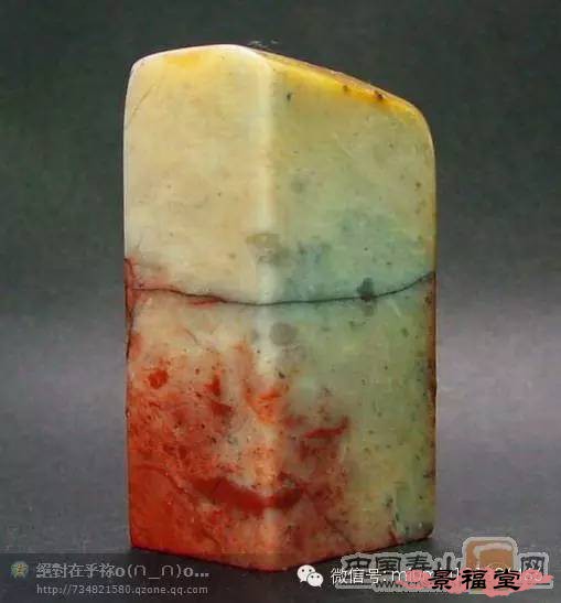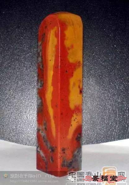 旗降石 产于寿山村北面之旗降山。石质结实、温润、坚细、凝腻,微透明或不透明,富有光泽,年久不变。色彩丰富,以红、黄、紫、白,或两色及多色相间者常见。主要以色相来细分其右,品种较多,是寿山石中的一大家族。