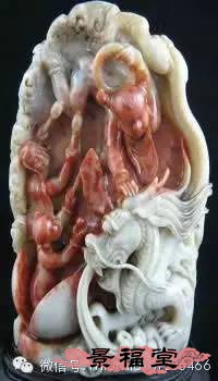 银裹金旗降石 旗降石中有白皮黄心者,称银裹金旗降石。佳者,皮如白高山冻石之凝腻,心似田黄石之细润,色界分明,温柔有加。