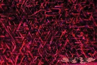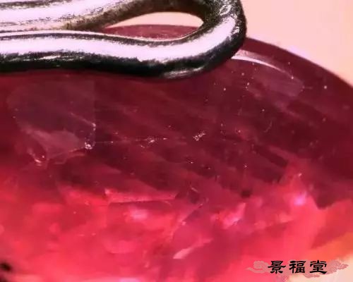红宝石透明但不清澈,用弱光斜射可见乳白色的丝光。在20倍放大镜或40倍显微镜下用弱光观察,可见平直或以60o、120o交角密集排列的丝绢状包裹体,它们是由细小的金红石定向排列形成的。