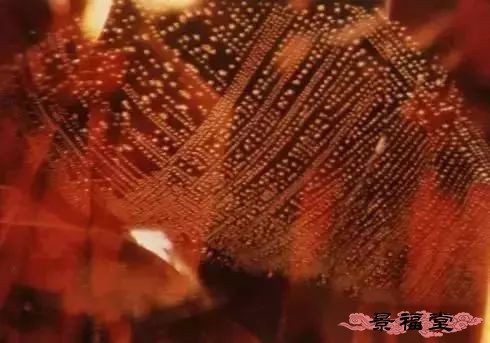助熔剂法合成红宝石一包裹体数量多为特点,主要有网格状、指纹状展布的褐黄色或黑色助熔剂小滴包裹体,黑色熔剂斑块,簇状排列的针状包裹体,以及三角形、六边形银白色或黑色铂金片包裹体等。
