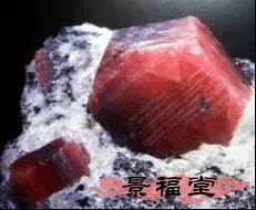 印度产于变质斜长岩中的红宝石,多呈玫瑰红色,粒度较大,透明度差,交角为60o、120o的双晶纹发育,四组阶梯状反光的裂理面清晰可见。