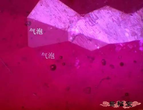 为红宝石中无色的气—液包裹体和无色的固态包裹体呈指纹状断续排列而成.其中,气—液包裹体多具有气、液两相,固体包裹体多呈棱角分明的短柱状。