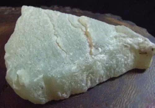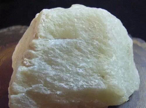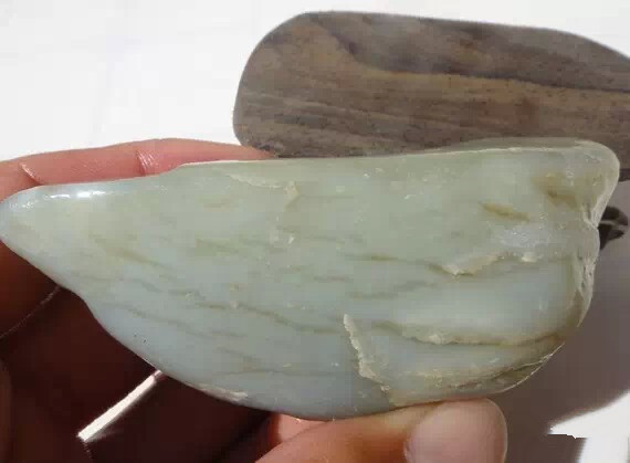 于田山矿玉:表面都是参差不齐的毛口表皮,内部特征是所有玉中最容易识别的。它的云絮状纹理长且松散,灯光照进去,像树木的纹理—样,长条状,长丝状云絮纹理历历在目,很好辨认,一看就明白。于田玉与和田玉比较,密度相对小,硬度差一些。上机器水作加工时,极容易沿长条、长丝状云絮纹理裂开。