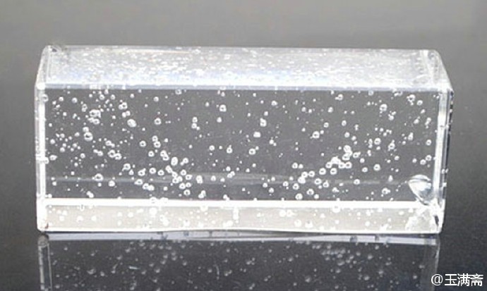 2、仿翡翠玻璃中常见气泡,现代工艺较好的仿翡翠玻璃的气泡虽小,用10倍放大镜配合手电照明也能看到,多呈粉绿色的小球状。