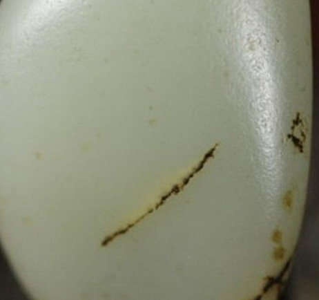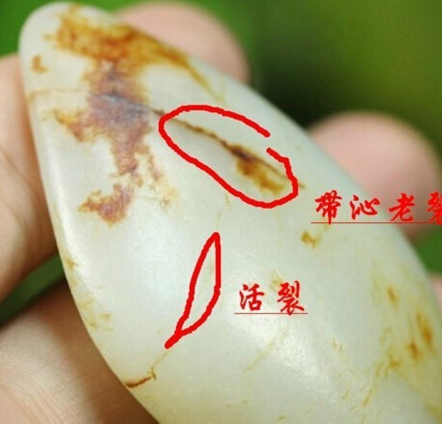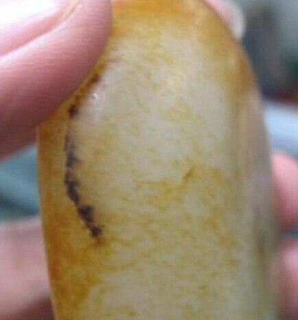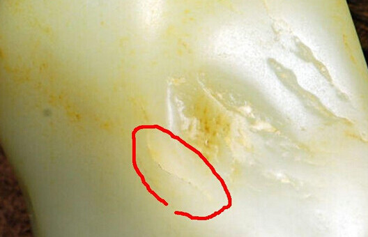 一般来说,死裂和玉石的表面呈小角度分布,较浅,由于形成的时间较长,这种裂伤往往带有沁色。我们也把这种裂称为“带沁老裂”。带沁老裂一般不会再发展,加之其带有的沁色变化多端,往往被视作了籽料的特征,个人认为是完全可以接受的。