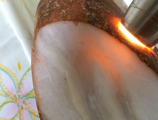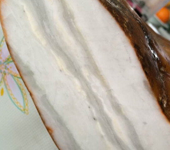 这是一玉友自认为捡漏的一块大料,皮的石性重,还伴有裂,打灯都很通透,一直对内部充满了好奇和期待。揣着一夜暴富的心态小心切开,里面已经窜糖,再次试探着切开,一片一片地切开,直到几乎整个人晕过去,里面能用的几乎没有。