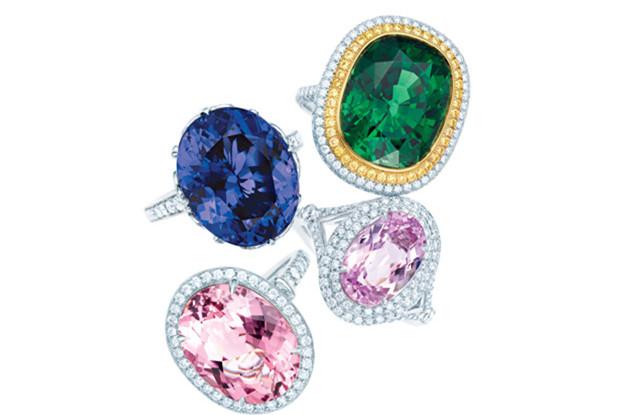 蒂芙尼彩色宝石和钻石戒指(上起,顺时针方向):沙弗莱、黄钻和白钻戒指;紫锂辉石和钻石戒指;摩根石和钻石戒指;坦桑石和钻石戒指。这四种彩色宝石均由蒂芙尼引入珠宝界。