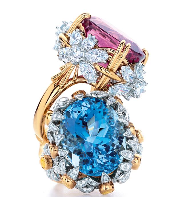 18k黄金镶嵌钻石和彩色宝石戒指,让-史隆伯杰为蒂芙尼专属设计。上:椭圆形切割红碧玺掩映在四朵钻石花朵之中;下:钻石雏菊花瓣烘托椭圆形切割海蓝宝石,点缀镶嵌黄钻