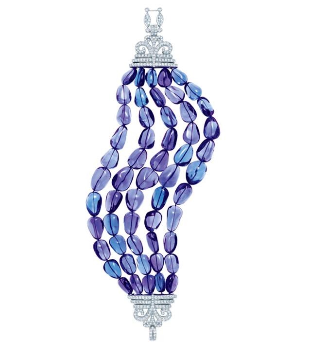 设计原型来自于印度次大陆的民间珠宝,将紫水晶、玻璃坠饰和翡翠融合在一起,从黄金打造的链索上垂坠而下,宛若晶莹剔透的葡萄。