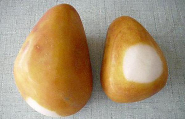 所谓滚料,是指把山料、青海料甚至俄料、岫玉等边角料,放入机器内滚动打磨,最后变成很像籽料的鹅卵石形状,再配以假皮。更有甚者,把大块的山料分割成小块,专门做滚料处理。