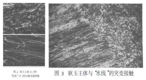 在扫描电镜下观察,样品的软玉主体和“水线”的结构特征有明显的差异。