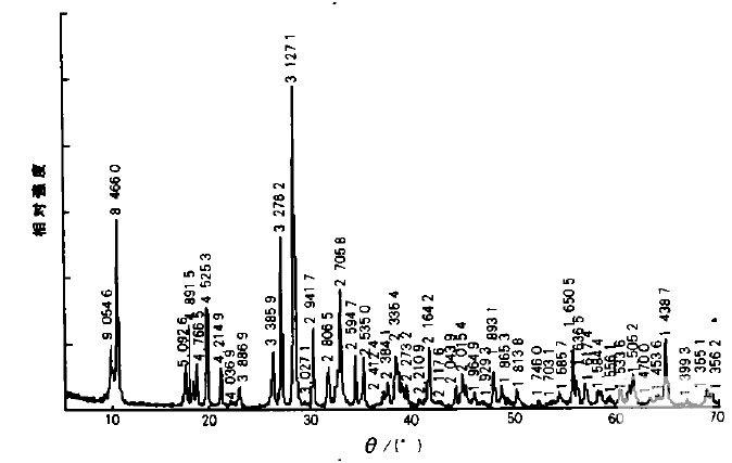 偏光显微镜下观察得知,“水线”的矿物成分主要是透闪石,其质量分数高达95%以上。为了准确地确定其矿物组成,对“水线”进行了X射线粉晶衍射分析(图1) 。由图1可看出,其主要谱线依次为31127 1 ( 310) , 8. 466 0 ( 110) , 3. 278 2(240) , 2. 705 8 (151) ;矿物X射线粉晶衍射鉴定手册 中透闪石的主要粉晶衍射谱线依次为:81400 ( 110 ) , 3. 110 ( 310 ) , 3. 270 ( 240 ) , 2. 703(151) 。由此可见,“水线”部分衍射的波峰位置和强度都与透闪石的接近。因此,“水线”和软玉主体部分一样,均主要由透闪石矿物组成。