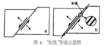 2、“水线”的成因模式:“水线”平直的边界和透闪石纤维的展布特点表明其曾经历了先剪后张、最后再定向挤压的过程。软玉形成后,透闪石等成矿物质的沉淀和成矿流体自身的封闭又导致流体压力的积蓄和周期性的重复,并最终促发了断层再次活动。断层活动导致先期形成的软玉中产生一系列平直的张剪性裂隙(图4) ,成矿流体长期积聚的压力也因此得到瞬间释放,并迅速充填进入微裂隙中,透闪石垂直于剪切应力方向生长,最终形成透闪石纤维。