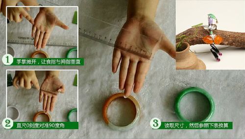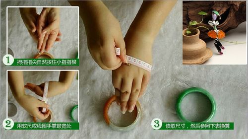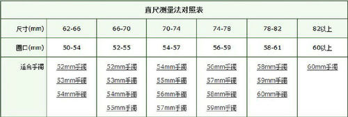1、软尺测量法:把大拇指指尖按住小指的指根处,注意要自然,不要太紧也不要太松。用软尺或者一根线围手掌最宽处的周长,量的时候如果手很软的女士可以量紧点,手骨偏硬的可以量到刚好把线拉紧的程度即可。把得到的长度除0.314,即是适合你的手镯内圈直径。例如左手量出16.8cm(168mm),除0.314后,即可确定适合配戴内圈53.5 mm的手镯。需要略松或略紧,前后可加减1-2cm,就是你的手寸实际大小,手镯的尺寸。
