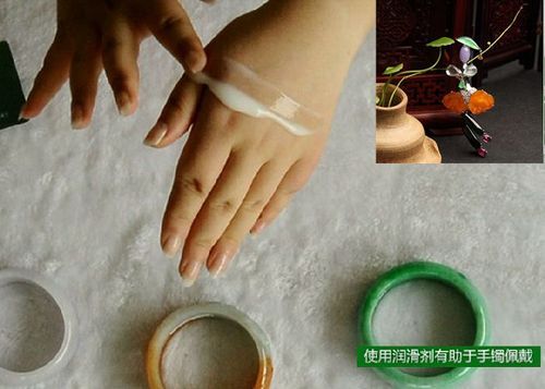 3、另一种方法,当手掌润滑之后,可以先戴进去四个手指,戴到底部,然后再伸进大拇指,这一种方法比较适合贵妃手镯,当然圆手镯也可以用这样的方法。这种方法,一般要注意的是,当伸进大拇指的时候,手镯容易退回去,所以一定找身边的人,帮忙扶着手镯。