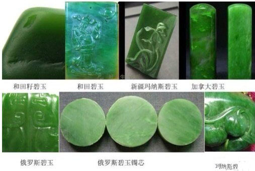 加拿大碧玉:加拿大碧玉的产地主要是在加拿大的温哥华以北的高山上,硬度约为摩氏6.5度,是软玉的一种,不但是加拿大的国宝,在清朝时更是慈禧太后的最爱。与新疆玛纳斯玉相比,具有产量大、质地更均一、块度大、颜色鲜艳等特点。由于原材料的供应,上世纪80年代到90年代,中国从加拿大进口了数百吨加拿大碧玉,这批碧玉具有体量大、绺裂少、色泽艳丽等特点,此批碧玉弥补了中国大陆碧玉原料供应不足的状况,由于都是山料,加拿大碧玉的产出体量很大,每块有4到5吨。北京、扬州、河南加工制作了一批以此为原料的玉雕作品。这些作品大多器型较大且质地完整。