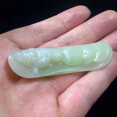 俏色巧用为玉雕琢工艺的一大特点,为玉雕界普遍应用。玉色以绿色为主,兼备黄、黑、红、白等色。有湖水绿、苹果绿、草绿及绿白等色。有的玉为杂色玉,红、黄、墨、绿诸色聚于一体,色彩斑斓,河磨玉玉色为墨绿,外包褐黄色之玉皮。玉料丰富的颜色和玉质为制作中巧用俏色提供了良好的物质基础,亦使玉制品精美、形象、生动逼真,给人栩栩如生、活灵活现的感觉,而使世人更加真爱。