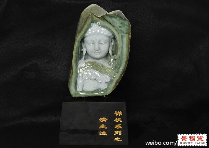 图片上这件作品《清生浊》出自于玉雕大师董春玉之手。作品中佛陀面容安详,意态温婉。五官面容细节表现得清晰,慈悲的神情自然而然的流露出,让人一看就与之产生共鸣。