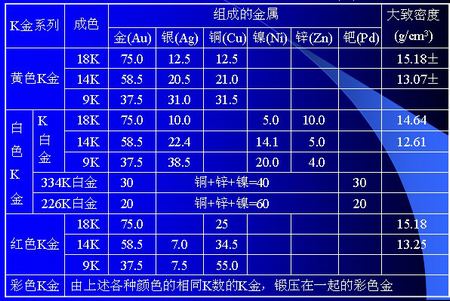 为解决纯金的柔软性,在纯金中加入银、铜、锌等金属以增加黄金的强度和韧性,这样制成的金饰称K金。K金物理性能稳定,在常温下不易氧化,退色。