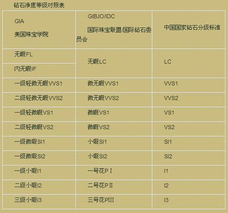 钻石结晶于地球深处地幔岩浆之中,其内部难免含有各种杂物或存在瑕疵。这些内含物的颜色、多少、大小、位置分布对钻石净度构成不同程度的影响。钻石的净度通常使用10倍放大镜对钻石内部、表面瑕疵及其对光彩影响程度对未镶嵌钻石的净度级别进行分级,按中国国检的标准细分为LC、VVS1、VVS2、VS1、VS2、SI1、SI2、P1、P2、P3共10个级别,P级钻以下一般不作为宝石用钻。