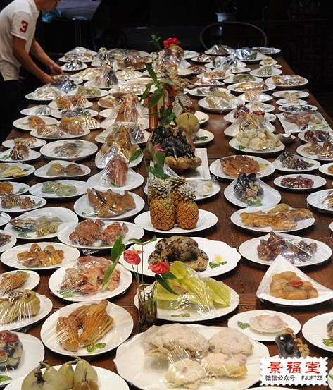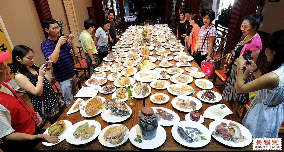 上图中这一桌满汉全席的所有菜品,皆是由寿山石雕刻而成。看到这里,相信很多人都会惊讶不已,更要问问这桌由寿山石雕组成的满汉全席的作者是谁了? 7月19日,寿山石雕精品名菜宴“满汉全席”展览在福州南后街展出,吸引众多市民及外地游客前来观展。此展由,利用雕刻创作而成。在展厅内,“满汉全席” 130道“菜品”,栩栩如生,令观众叫绝。图为寿山石雕精品名菜宴“满汉全席”展令观众叫绝。