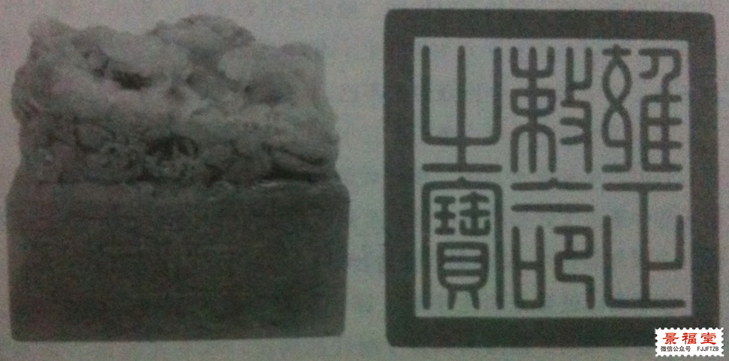 寿山石覆斗钮,通高10厘米,10厘米见方。石红白色相间,其上正中瑾一,左右蟠螭各一。镌阳文“雍正御览之宝”汉篆字。