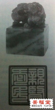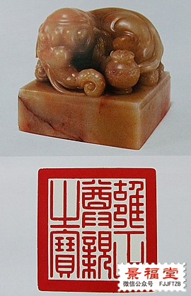 寿山石雕异兽钮,通高9.2厘米,6.6厘米见方。寿山石红白色,钮雕异兽钮二。镌阴文“亲贤爱民”汉篆字。