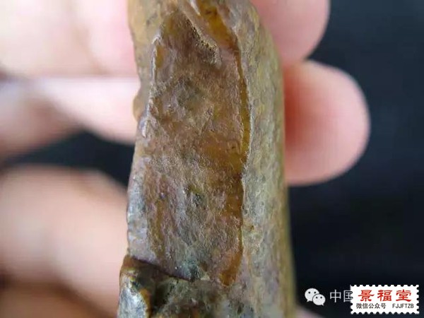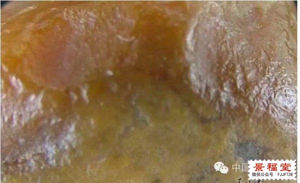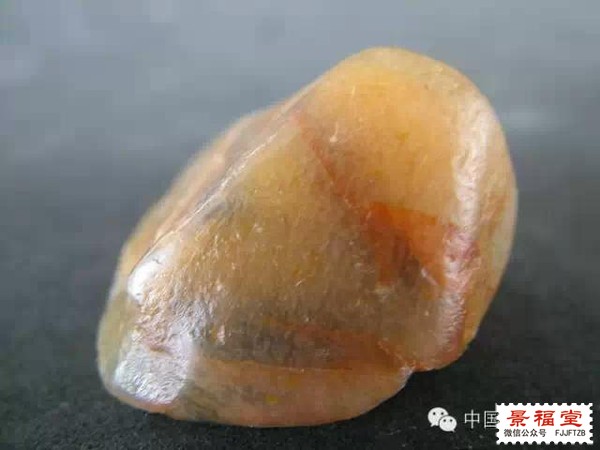 透明石皮 一种很特殊的石皮,和白皮形成过程一样,也是被溪水沁浸,而被溪水带走色彩,加上田黄本身透明度高,就会形成透明石皮。(两者的区别是,白色石皮除了色彩被带走,还由于和周围环境的相互交换作用,表皮形成肉眼很难看出的微小白色泡泡,所以看上去是白色的石皮,而透明石皮的只是被带走色彩或泡泡很少,加上本身的透明度,就形成了透明的一层) 也有认为透明石皮是白色石皮其中的一种,也有认为透明石皮就是没有石皮(薄的透明石皮从正面看不太出来有石皮)