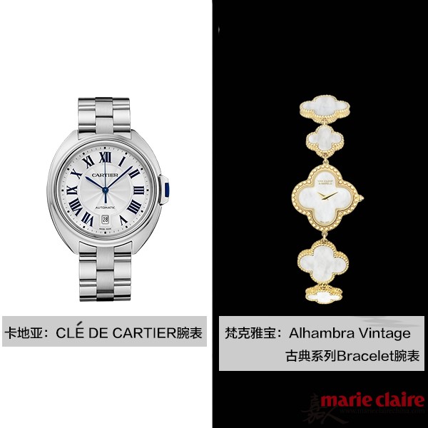 CLÉ DE CARTIER腕表凭借金属质感和简约的线条创造了优雅外观,如凯特王妃般端庄大方。而Alhambra Vintage古典系列Bracelet腕表则继续沿袭了梵克雅宝的标志性四叶草图案,像极了手链,增添如夏琳般的温柔性感。