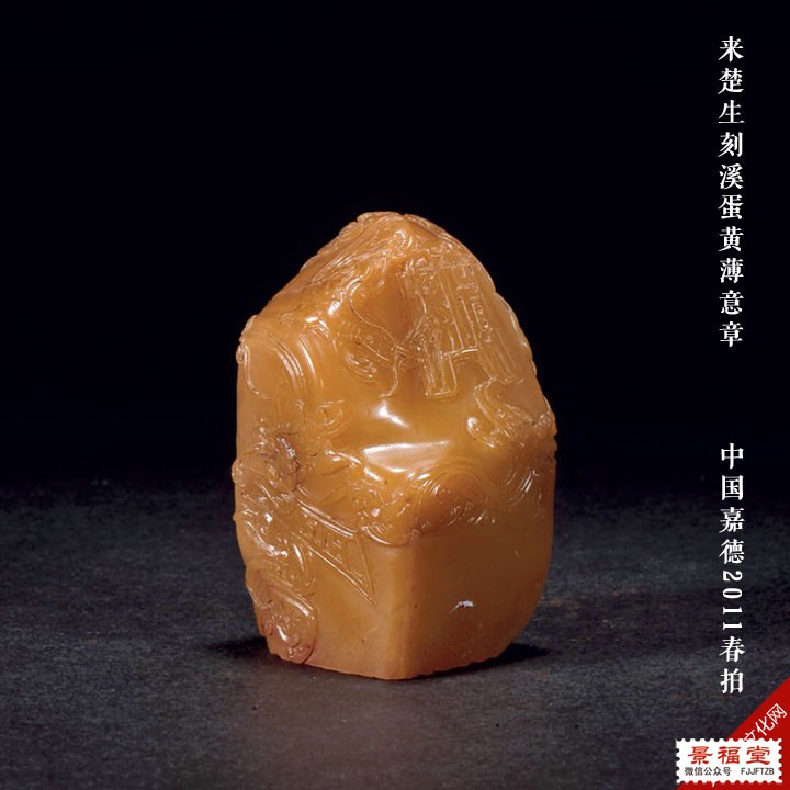 芙蓉系石亦有独石,即《小志》中所谓“溪蛋”,也叫“溪卵黄”。《小志》记:“溪蛋为溪石随流冲荡,形成椭圆如卵,肤黄内白,性坚如水黄,佳者似田黄,俗呼溪蛋田。又有一种,相传石工采芙石,掷其屑于溪,长期为水冲激,遂成溪蛋。此种多质嫩,外呈黄绿色,似竹头窠而黄,红痕粉白块俱在,犹不变其为芙蓉也。”