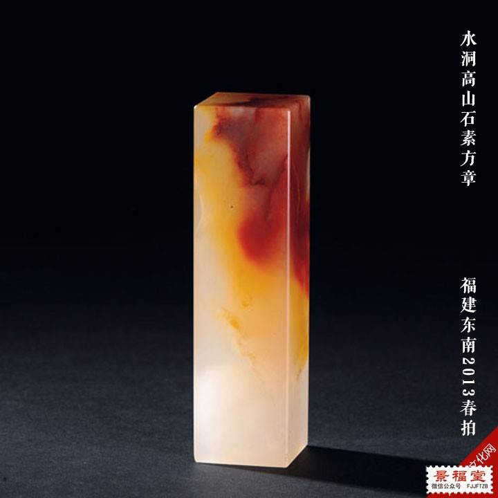 高山石是寿山各石种中的“第一大户”,品种之丰,色彩之繁,远胜其他。《寿山石小志》记:“高山为寿山之最高峰,清乾隆时开始采掘。有大健洞、世元洞、嫩嫩洞等,皆因采石人之名而名。又有和尚洞,大洞,水洞,新洞,啼嘛洞,四股四,油白等洞……色较他石特多,有红、黄、白、灰诸种,复有黄白相间者,白中多红点及红块者,白中夹灰块及紫块者,红黄白三色相间者,不一而足。石中多红紫痕似水纹条纹,错杂散乱,故色纯者难得。尚有俗称玛瑙洞者,黑色中环绕红黄白蓝紫诸色条纹,甚可爱。另有黑地中显灰白条纹如牛角者,亦可玩,实皆出于和尚洞附近。”