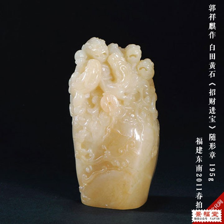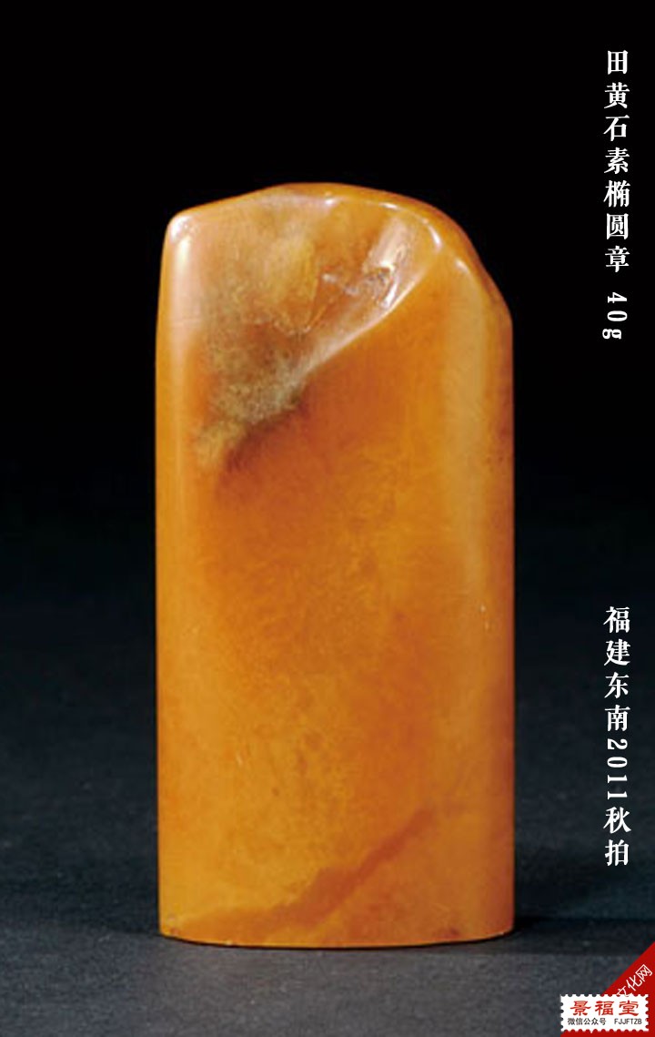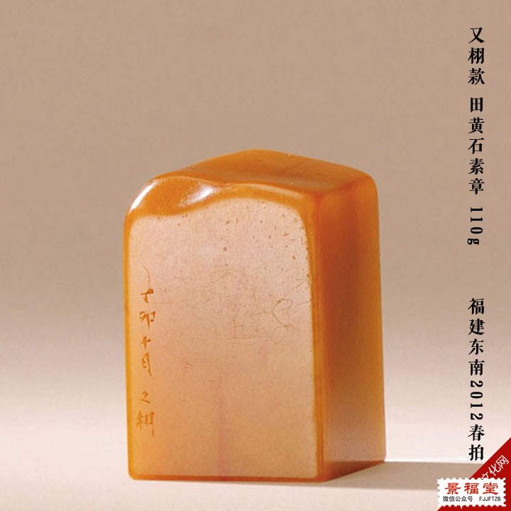 “田黄,即黄田石,俗倒呼为田黄,为我国印石之名贵珍品。明末清初即为印石之王,以重量计值,两以上价超黄金数倍。田黄有黄金黄、桔皮黄、桂花黄、枇杷黄、鸡油黄、栗子黄、杏黄、葵黄、皂黄诸名种,皆以色类似而名。又有内包白色薄片,内纯黄者,俗名银包金。田黄皮多牙黄色,而不透明,里则半透明,玲珑可爱。其通灵澄澈者,为田黄冻,大者极为罕见,价值连城。”