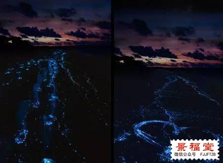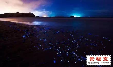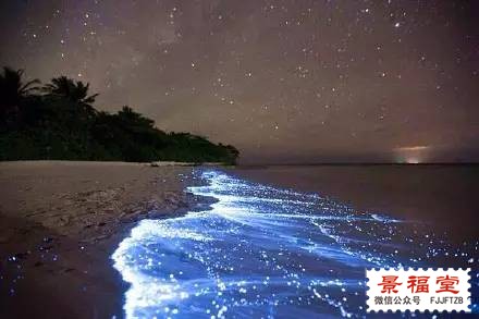 马尔代夫Vaadhoo岛边海滩的夜晚,在海浪的拍打下,不断出现荧光色的蓝点,整个海岸线犹如浩瀚的银河星空,仿佛置身在“阿凡达”的美妙世界里....... 这些蓝色的荧光是一种叫“蓝眼泪”的海洋微生物,靠着海水的某种能量生存。不过离开海水的“蓝眼泪”只能存活一分多钟,随着能量散尽,生命就会逐渐消失.... (资料整理自网络)