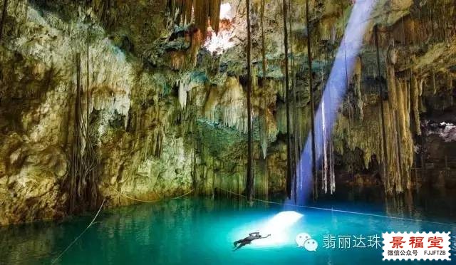 洞穴中的水本来清澈纯净、轻灵欲滴令人美不胜收。这时候,恰好一束光线直射下来,穿过透明的水域,光线在水里反射、折射,使得整池水都晶莹透亮,富有动感,充满生机。